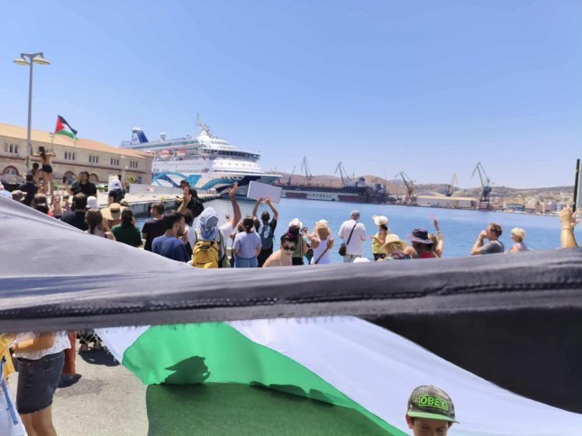 Around 150 protesters stopped the Crown Iris from docking on Syros on Tuesday while waving Palestinian flags and holding banners reading ‘stop the genocide’.