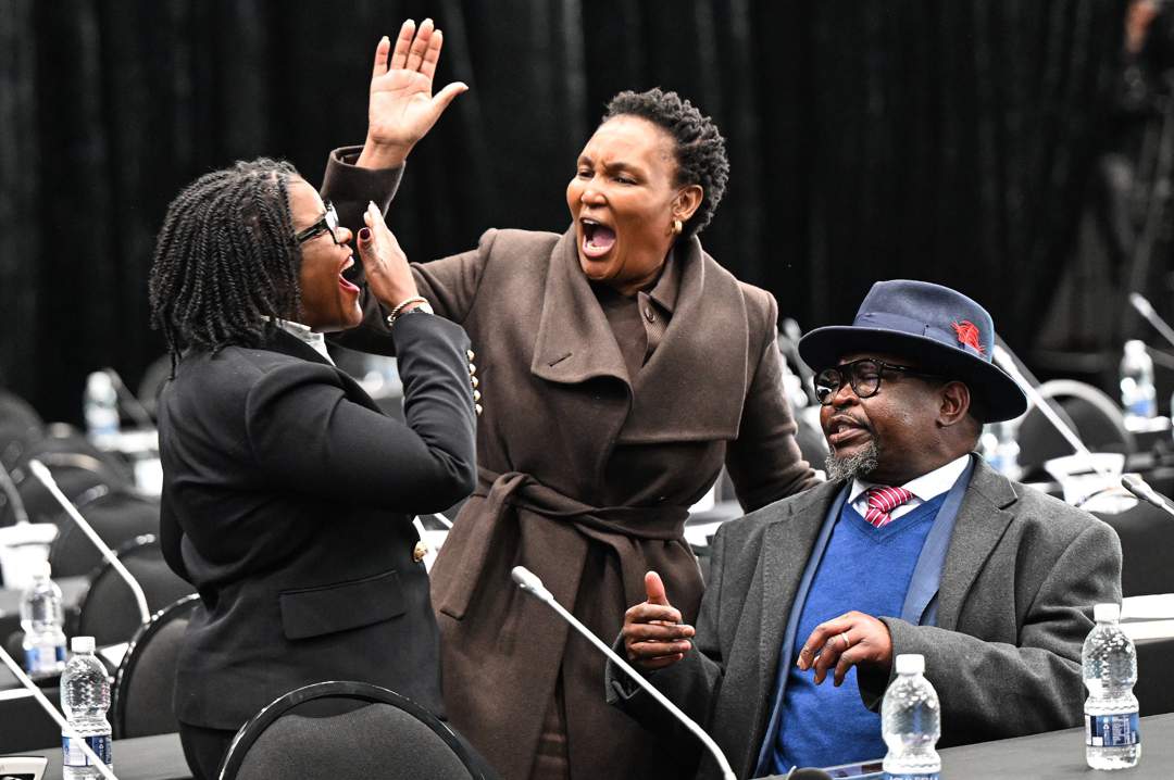 ANC MP Nobuhle Nkabane greets Human Settlements Minister Thembi Simelane and Finance Minister Enoch Godongwana ahead of the votes on the Appropriation Bill on Wednesday.