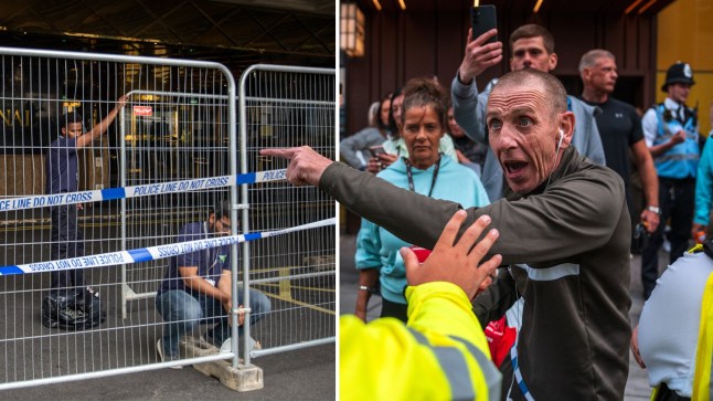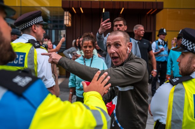 A man gestures next to a police officer during a protest outside the Britannia International Hote (Picture: Carl Court/Getty Images)