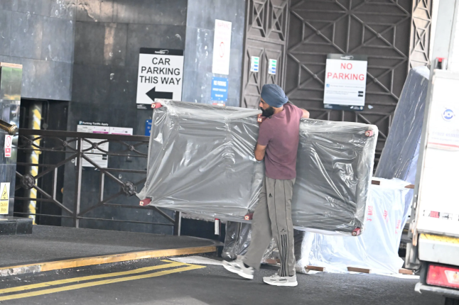Workers could be seen loading mattresses into the hotel in Canary Wharf (Picture: Jeremy Selwyn)