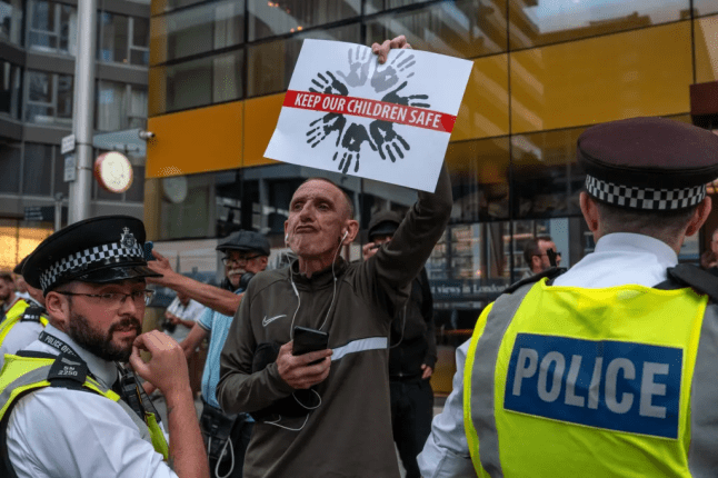 A man holds up a Keep Our Children Safe poster during a demonstration outside the Britannia International Hotel (Pictures: Getty Images Europe)