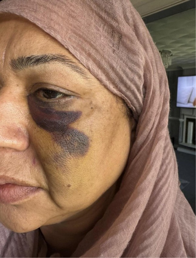 Injuries suffered by the defendants’ mother during the incident (Picture: PA)‘He has come into this courtroom and he has lied to you.’Amaad did ‘no more than was necessary’ to defend his brother and then himself as he believed he was ‘under attack’,she continued..Taser strikes were fired at both brothers,the court has heard,and their mother,Shameem Akhtar,was injured in the melee.The defendants say PC Marsden tasered Ms Akhtar in the face,while the officer claimed Amaad accidentally elbowed her.After the apparent head-stamping shown in the viral clip,Ms Gardner said,PC Marsden went on to kick Amaad in the stomach and the groin and ‘smack him in the head’ with his Taser.