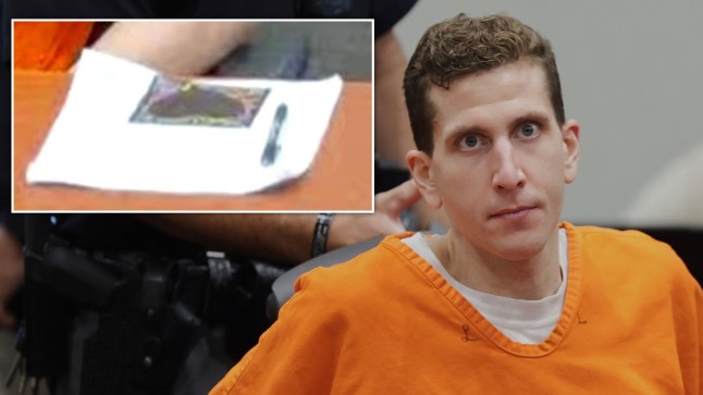 Bryan Kohberger had an odd black heart drawing in front of him at his sentencing hearing (Picture: Idaho Fourth District Court)
