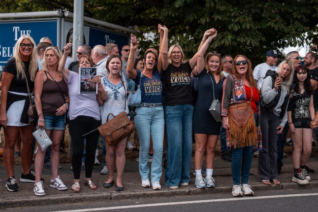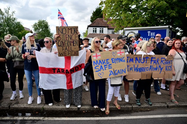 Protesters wave St George’s flag and hold placards reading ‘Make Epping safe again’ outside the Bell Hotel (Picture: James Veysey/Shutterstock)