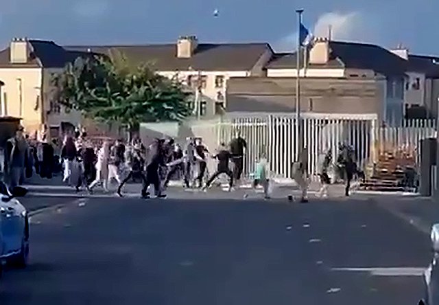 Huge groups of men were later seen clashing and chucking wooden planks (Picture: @BoyneNews)At the same time,his pals chuck heavy objects over the fence and wave golf clubs.It is at this moment that a little girl can be heard screaming ‘Daddy’ to an unidentified man.The gut-wrenching cry gets a reply of ‘you’re all right’,before he tells the fighting youngsters: ‘Calm down lads’.While some scatter from the missiles coming towards them,some youths on the other side of the fence attack back as the situation escalates.