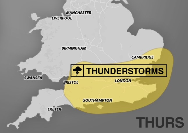 People heading out and about today should carry an umbrella because thunder and heavy rain are forecast in London and most of the south today.