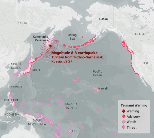 The first tsunami waves landed on Russia’s Kuril Islands on the Kamchatka peninsula,which sits on the ‘Ring of Fire,’ an area of the Pacific with high seismic activity.
