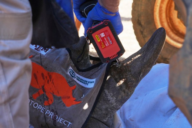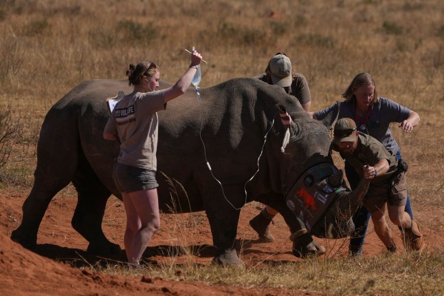A scientists injects the horn of a rhino with radioactive isotopes at a rhino orphanage in Mokopane,South Africa (Picture: AP)