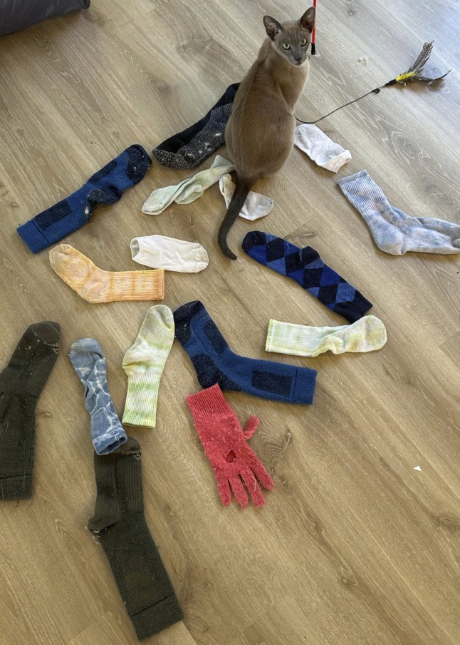 The 15-month-old feline thief has expensive taste too – seeking out silk boxer shorts and thick men’s work socks,often with the clothes pegs still attached.