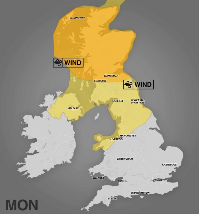 The storm will mostly affect northern parts of England,north Wales,Scotland and Northern Ireland (Picture: Metro)The yellow weather warning is in force from 6am until a minute before midnight.From 10am,it will be joined by an amber wind warning for much of mainland Scotland,the Inner Hebrides and the Western Isles lasting until 10pm.The Met Office warns of a potential danger to life from ‘large waves and beach material being thrown’ in coastal parts of the country.