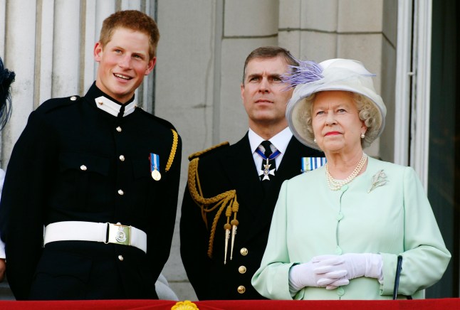 Prince Harry standing next to Andrew alongside the late Queen on the balcony of Buckingham Palace in 2005 (Picture: Getty Images)