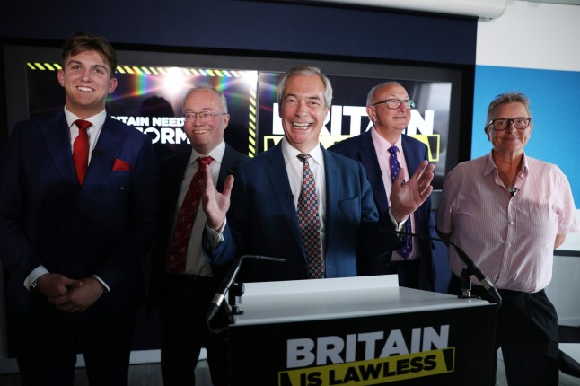 Nigel Farage with Reform councillor George Finch,far left,Rupert Matthews,left,and ex-prison governor Vanessa Frake-Harris,far right (Picture: Dan Kitwood/Getty Images)