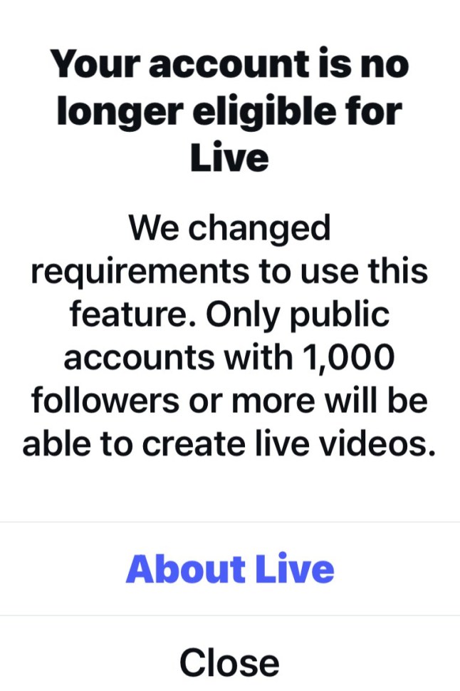 Now,users who don’t have public accounts and have fewer than 1,000 followers will be greeted by a pop-up when they try to go live.
