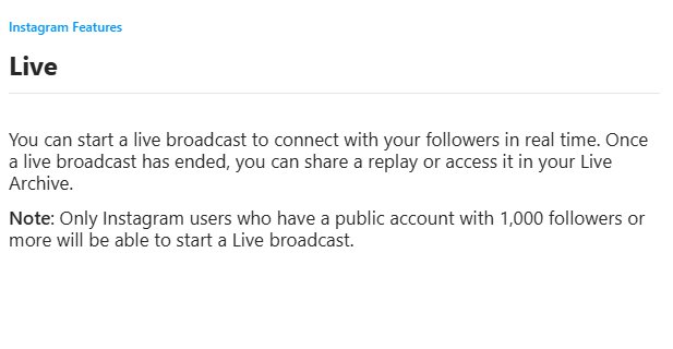 Instagram’s Help Center states: ‘Only Instagram users who have a public account with 1,000 followers or more will be able to start a Live broadcast.’