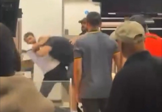 Another member of staff was seen trying to break up the row as two men start lunging at each other.