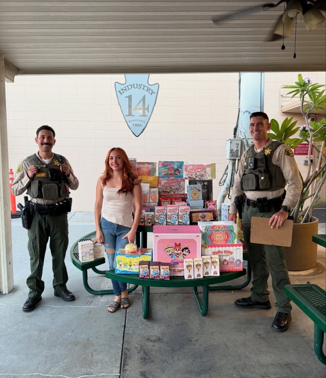 Police swooped in and by Thursday and had helped the shop recover some of the items. A storeowner posed next to two deputies with Industry Sheriff’s Station and a table stacked with Labubu doll boxes.