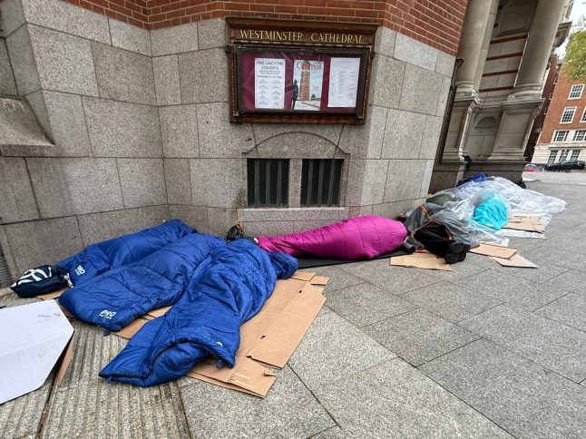 Dozens of people sleeping rough outside Westminster Cathedral in April 2025 (Picture: w8media)