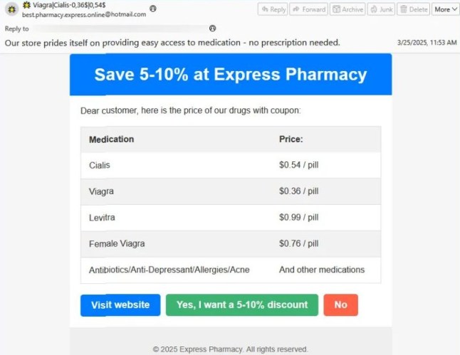 A scam email directing people to a fake pharmacy website (Picture: Gen Threat Report)