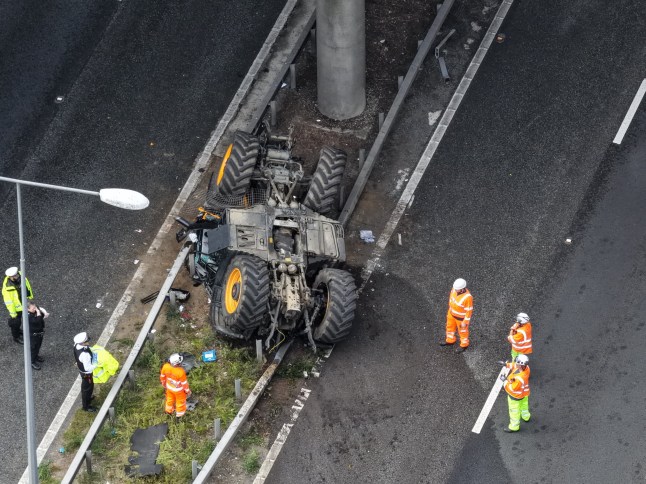 The tractor,reportedly carrying thousands of raspberries from a farm,burst through safety barriers from the A227 bridge near Wrotham in Kent and fell onto the central reservation of the M20.