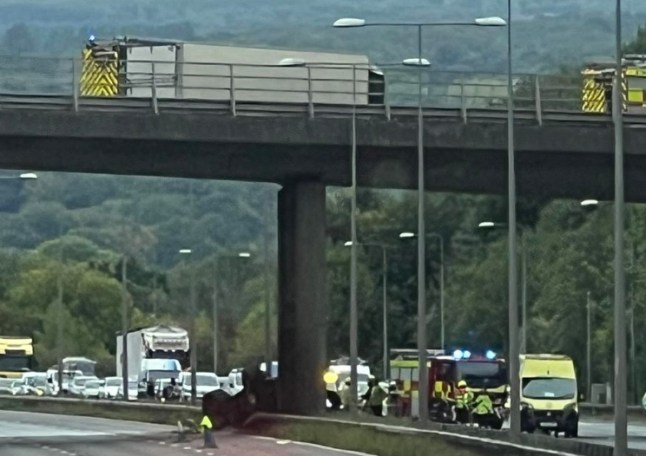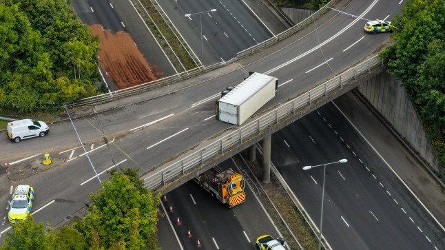 A large white trailer disconnected from the tractor was pictured lying on its side on the bridge above.