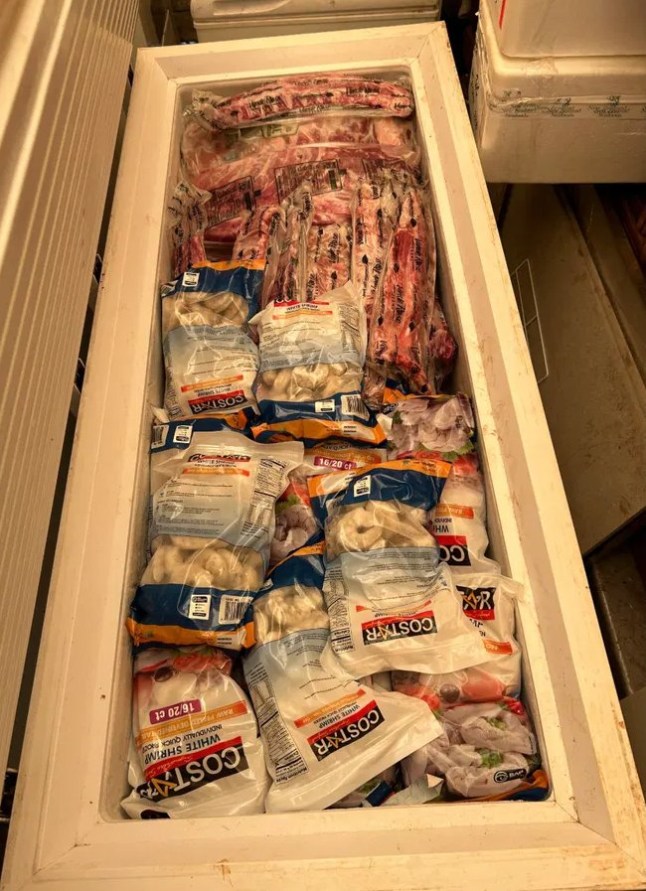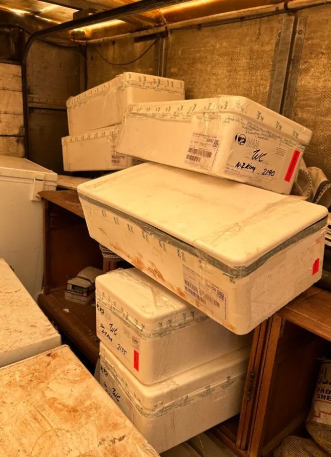 Photos from the scene showed large white freezer boxes filled with raw,frozen meat and white shrimp with labels from Sierra Meat and Seafood in Reno,Nevada. The freezer boxes were stacked inside a makeshift shed.