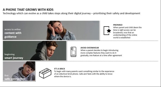 It offers another option from the ‘brick’ type phones many parents have turned to,allowing children to access social media and messaging if their parents agree,but with extra layers of safety inbuilt.
