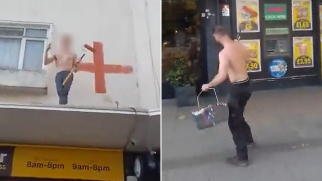 They paint several England flags on top of the estate before one of them appears to shout a racist slur at a woman walking with a child.