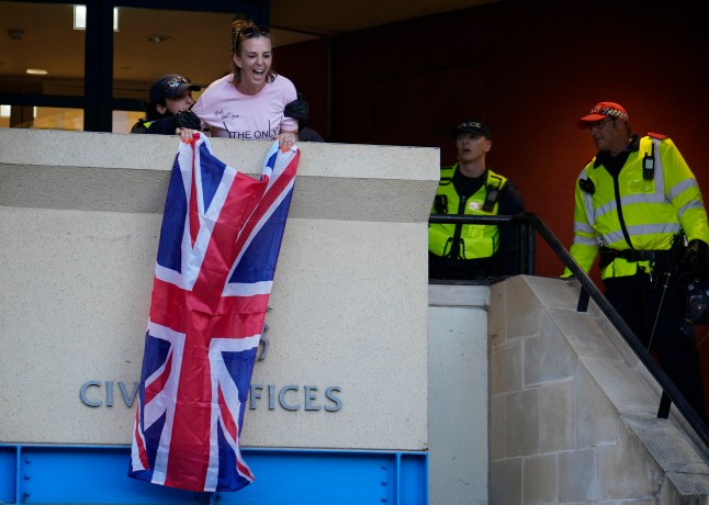 Police were seen dragging away one woman who unfurled a Union Jack on the council offices.