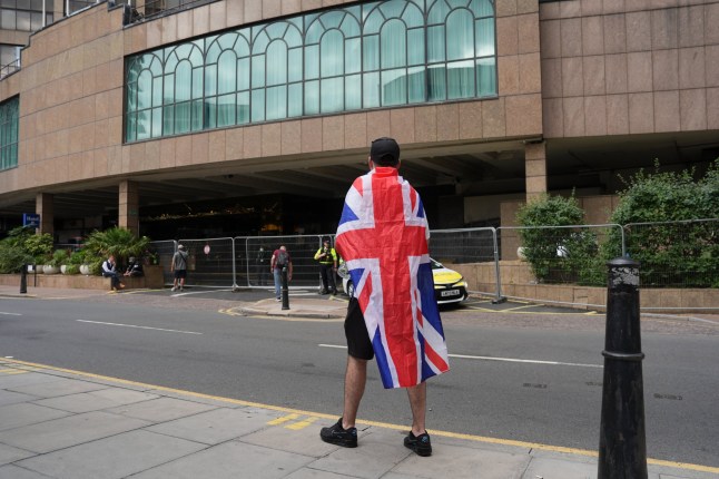 Men draped in flags walked outside the hotel perimeter (Picture: PA)