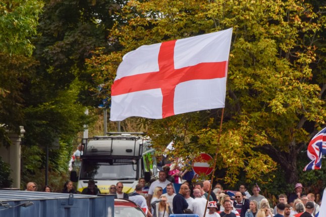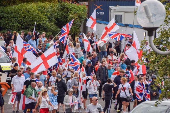 Protesters waving union and St George’s flags outside the Crowne Plaza hotel (Picture: ZUMAA Press Wire/Shutterstock)