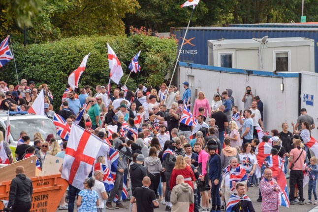 Crowds wave flags outside the hotel on Stockley Road near Heathrow (Picture: ZUMA Press Wire/Shutterstock)
