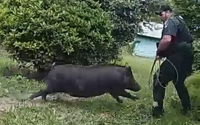 A wild boar charged at a sheriff’s deputy holding rope and trying to lasso it (Picture: Jam Press/Lee County’s Sheriffs Office)