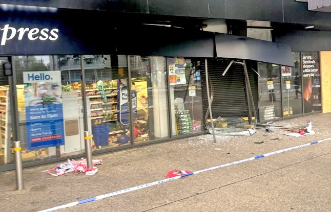 The doors and surrounding walls to the shop on Stratford High Street have been crashed down,boarded up,and then crashed down again as it attempts to stay open.