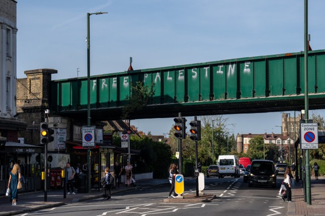 Pro-Palestinian graffiti sprayed on a railway bridge in Golders Green,north London (Picture: PA)