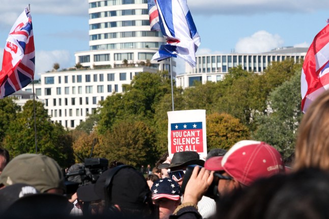 A protester holds up a placard reading ‘You can’t silence us all’ at Hyde Park (Picture: Shutterstock)