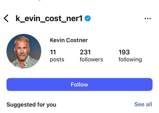 Typing in ‘Kevin Costner’ on Instagram,an account with a photo of his face and a blue tick appeared within seconds.
