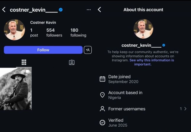 This verified Kevin Costner was based in Nigeria,despite the actor living in Santa Barbara (Picture: Instagram)