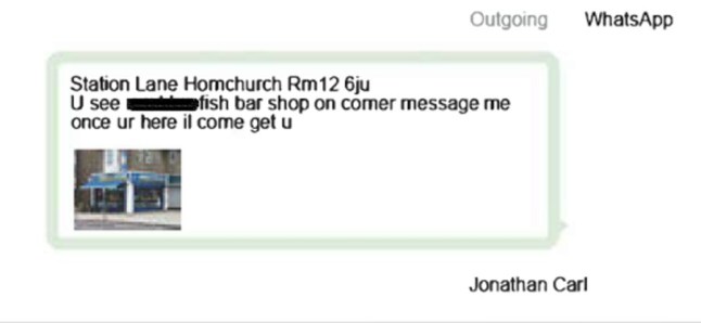 A message sent by Carl to one of his victims,asking them to meet him at a fish and chip shop (Picture: Met Police)