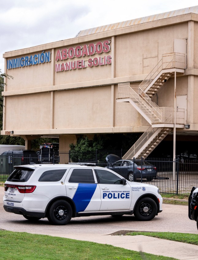 A vehicle with a sign posted on the side was searched by law enforcement agents near the scene of a shooting at an ICE facility in Dallas (Picture: AP)