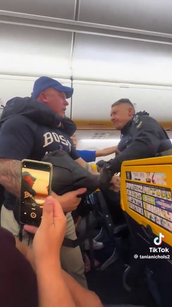 Footage shows a swearing man grappling with armed officers before being led off the plane as passengers cheer and sing ‘cheerio,cheerio,cheerio’.