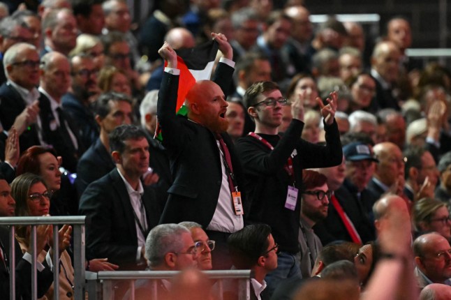 During the Labour Conference today in Liverpool,a man waving a Palestinian flag began shouting,‘There have been two years of genocide and mass starvation of Palestinians.’