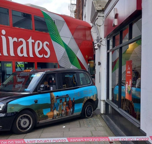 A double-decker crashed into the row of shops at 1.40pm (Picture: Presshop)