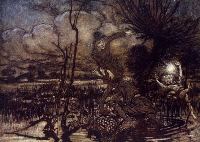A 1911 illustration of a will-o’-the-wisp luring men into danger over a marsh (Picture: Kharbine-Tapabor/Shutterstock)