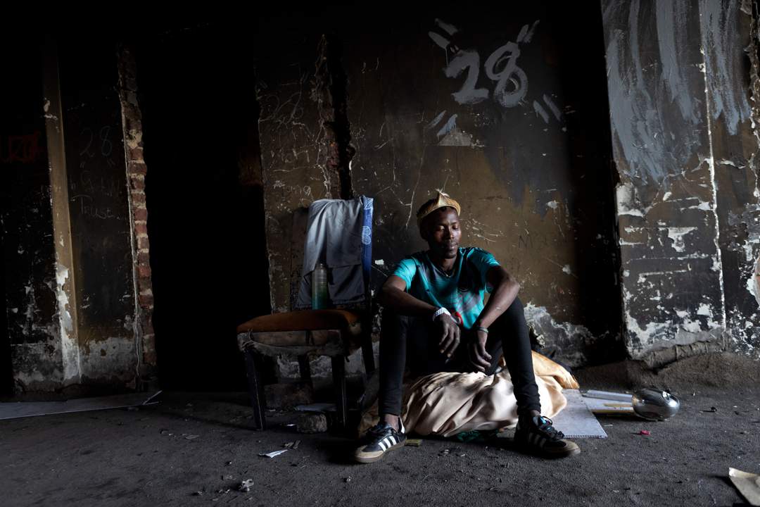 Vuyo Jijingubo poses for a portrait inside the abandoned building on Natal Street where he lives in Yeoville,Johannesburg.