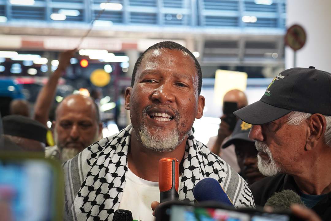 Mandla Mandela addresses supporters at OR Tambo International Airport after returning from the mission to end the humanitarian aid blockade in Gaza.