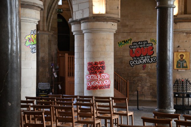 Worshippers have been left outraged after Britain’s oldest cathedral has been covered in graffiti-style art.