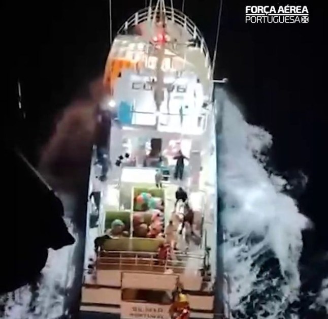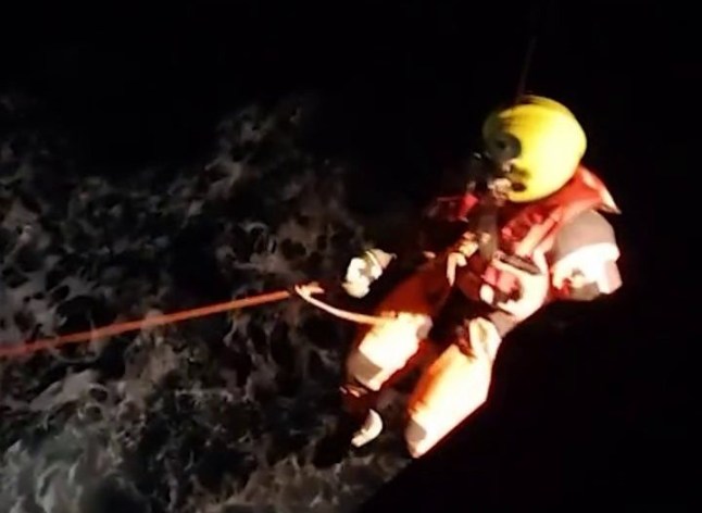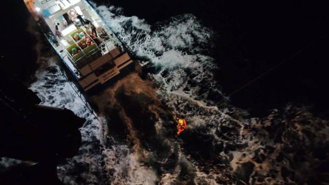 Extraordinary footage taken from the helicopter shows the rescue crew descending on the stricken vessel as it’s buffeted by waves in the pitch black of night.