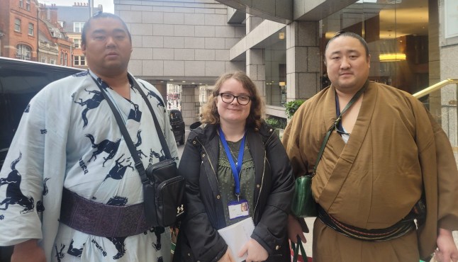 Sumo wrestlers Shonanoumi (L) and Sadanoumi had time to pose for a picture with Metro’s reporter Molly during London sightseeing (Picture: Metro/Molly Lee)