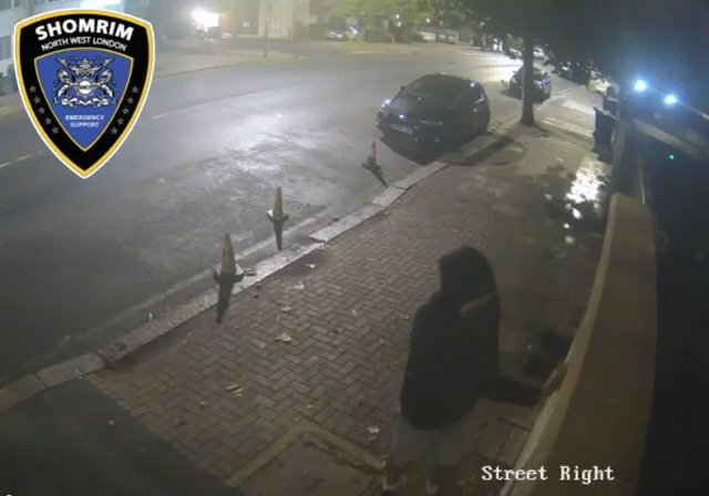 A grab from CCTV footage showing a man wearing a hooded jacket daubing a substance thought to be faeces on a synagogue wall (Picture: Shomrim)