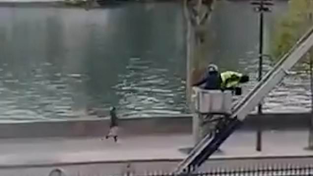The pair,one in a hi-vis jacket and the other in a motorbike helmet,are seen gently lowering themselves from a balcony,looking more like maintenance workers than criminal masterminds from a heist film.